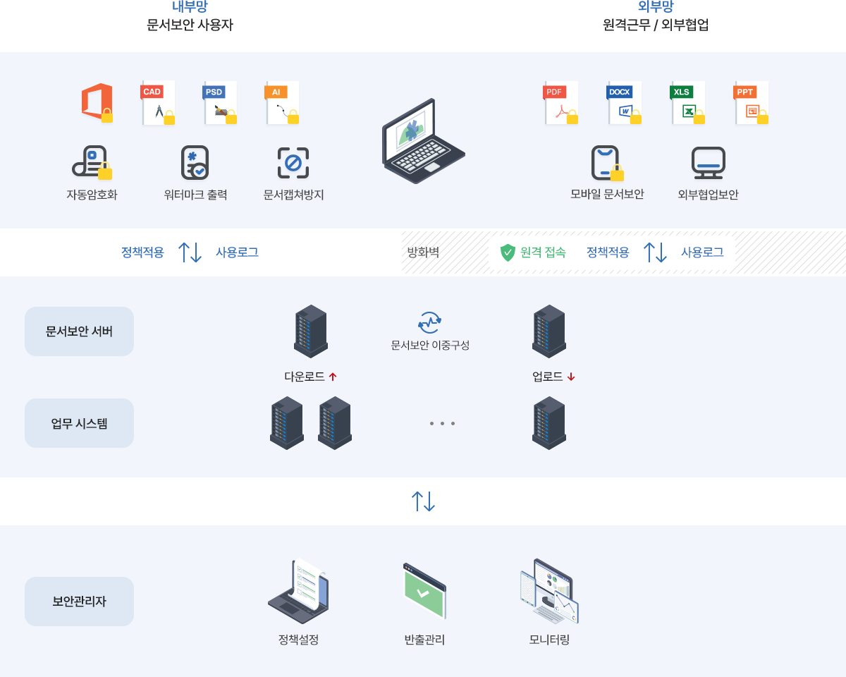 강력한 암호화로 사내에서 만들어지는 모든 문서(오피스·한컴), CAD, 이미지(PNG·JPG·JPEG) 파일을 보호합니다.