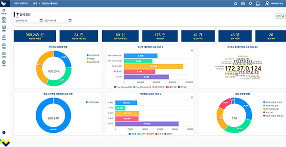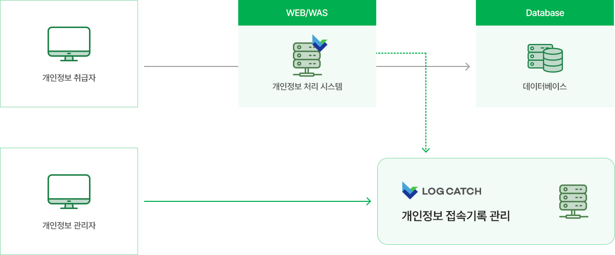 Log Catch 는 개인정보처리시스템에서 수행한 모든 업무내역에 대해 육하원칙(5W1H)으로 접속기록을 생성부터 안전한 보관 및 개인정보 오남용/유출 등의 이상행위를 식별, 감시 관리 기능을 제공하여 "개인정보의 안정성 확보조치기준 " 고시 제 8조, '접속기록의 보관 및 점검' 및 접속기록과 관련된 개인정보보호법 컴플라이언스 대응하는 솔루션 입니다.